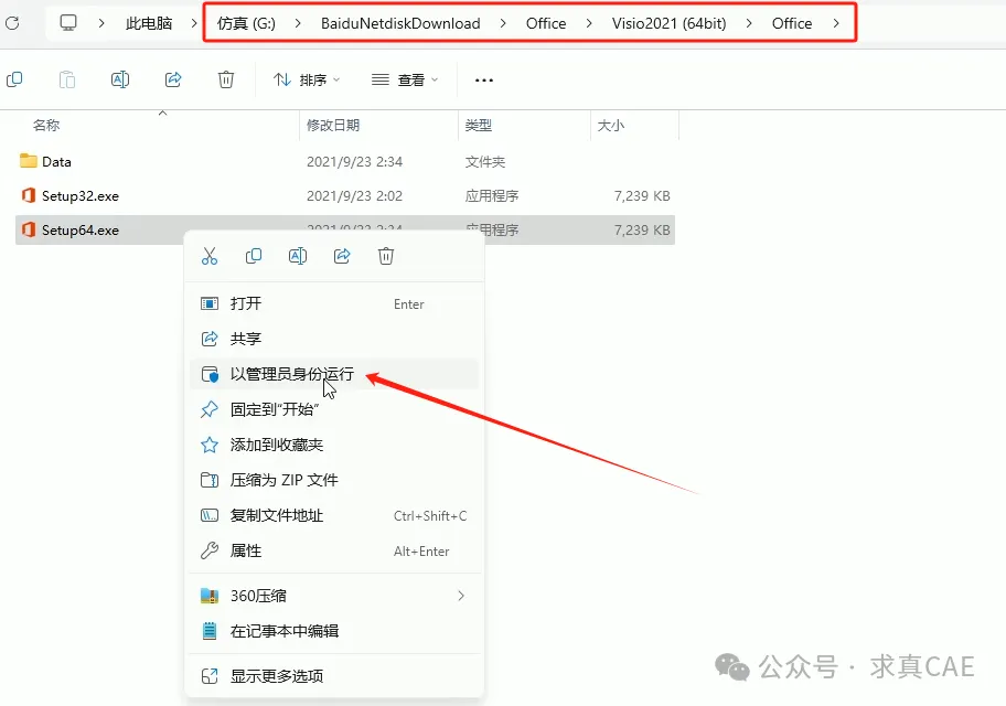 5、进入Visio安装包下【Office】文件夹,鼠标右键单击Setup64.exe,以管理员身份运行。