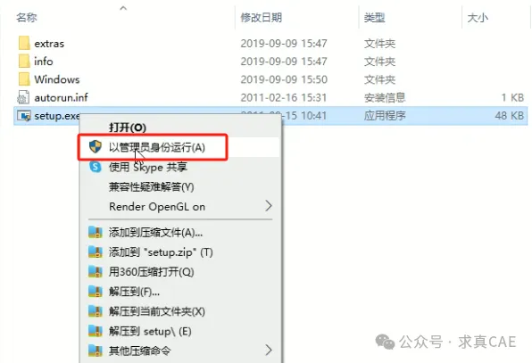 2、打开“install”文件夹,选择“setup.exe”安装程序,右键选择【以管理员身份运行】。