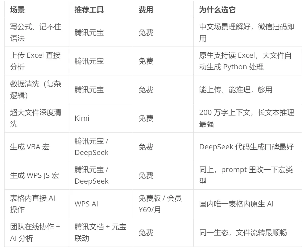 所以不是二选一的关系——日常分析用元宝(免费、功能全),高频表格操作用 WPS AI(省切换窗口的时间)。如果日常工作大量时间泡在表格里,WPS AI 值得试一下。