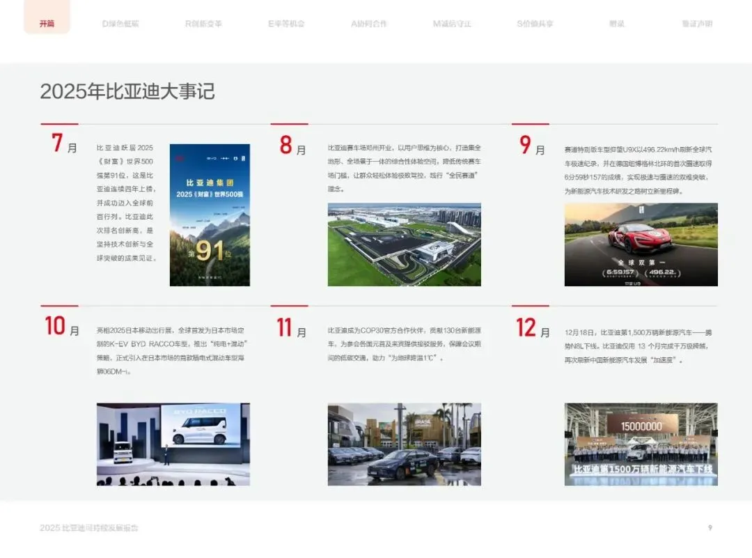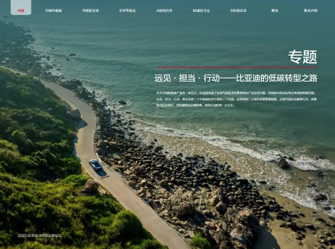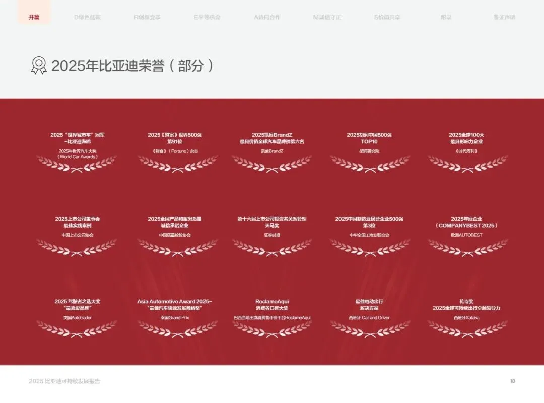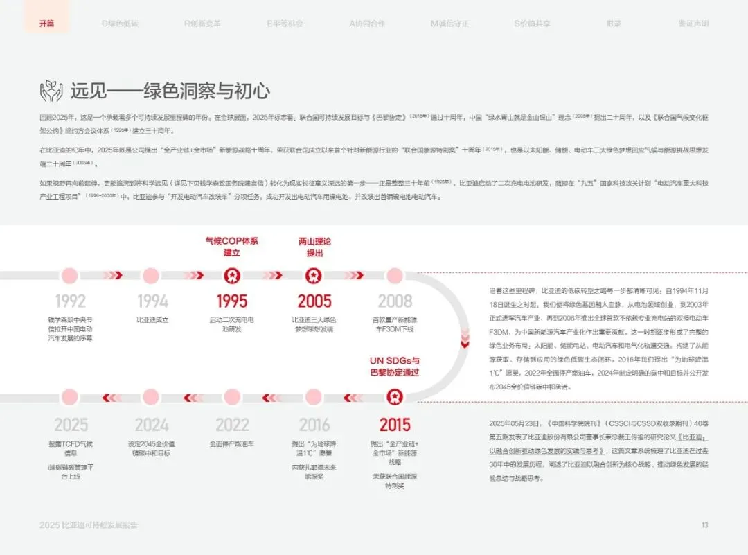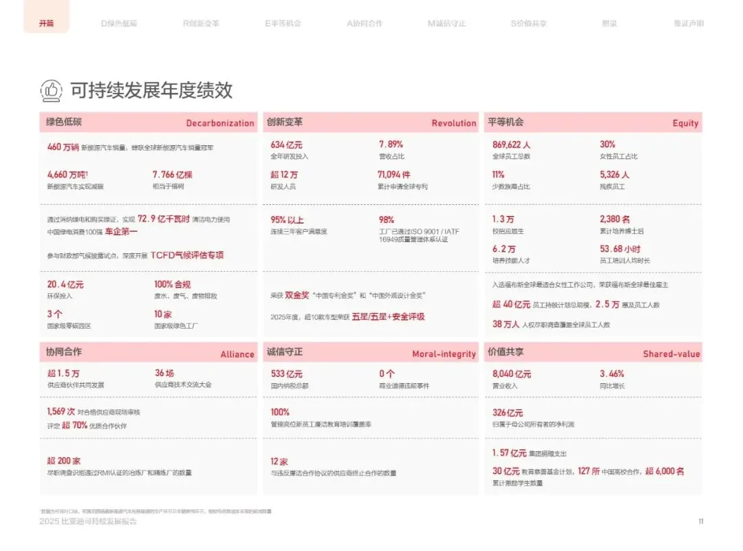《比亚迪2025年度可持续发展报告》围绕绿色低碳、创新变革、平等机会、协同合作、诚信守正、价值共享六大支柱,系统呈现公司在环境、社会、治理领域的年度实践与绩效。