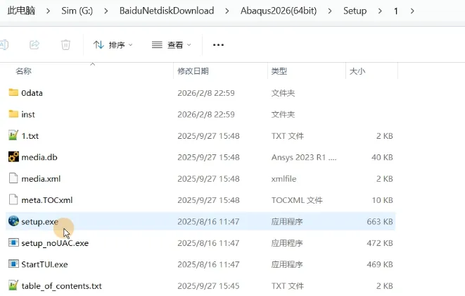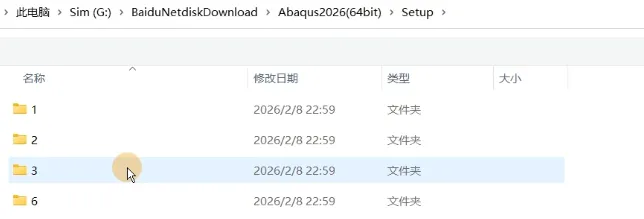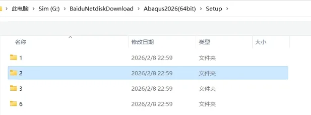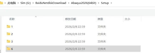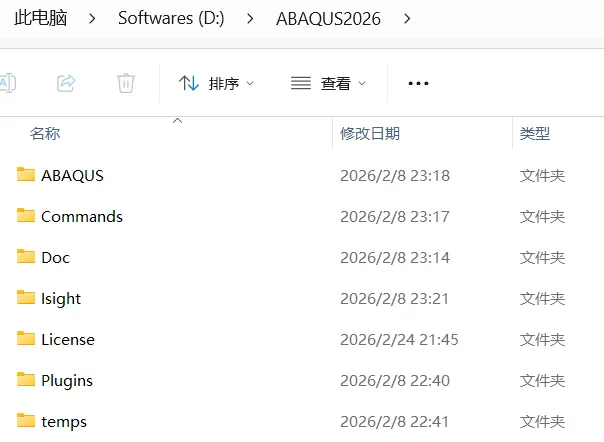 1、解压下载下来的软件安装包并打开,检查文件内容。在D盘中创建ABAQUS2026安装文件夹,并在对应文件夹下创建ABAQUS、Commands、Doc、Isight、License、Plugins、temps几个文件夹。