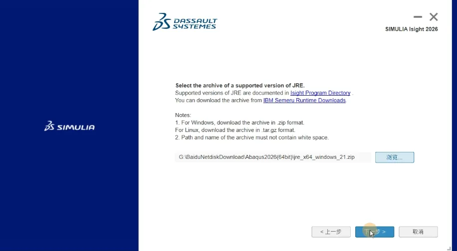 48 、单击浏览,找到Setup文件夹下的压缩包jre_x64...,然后打开,单击下一步