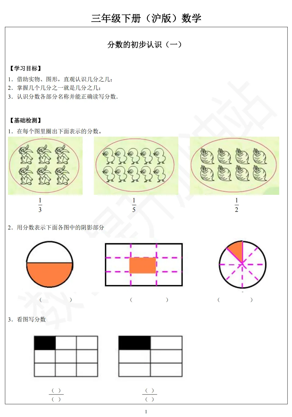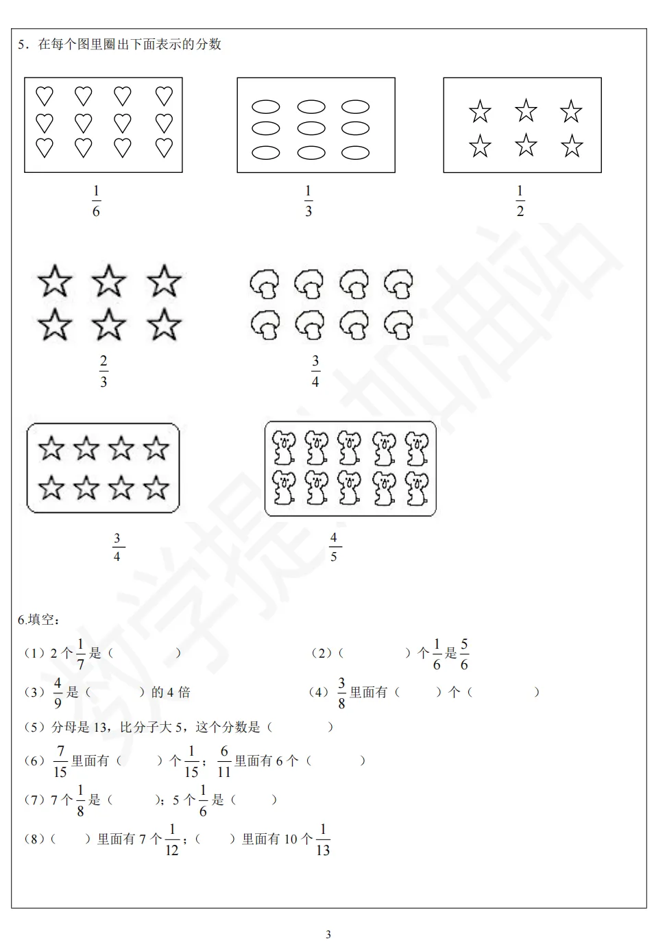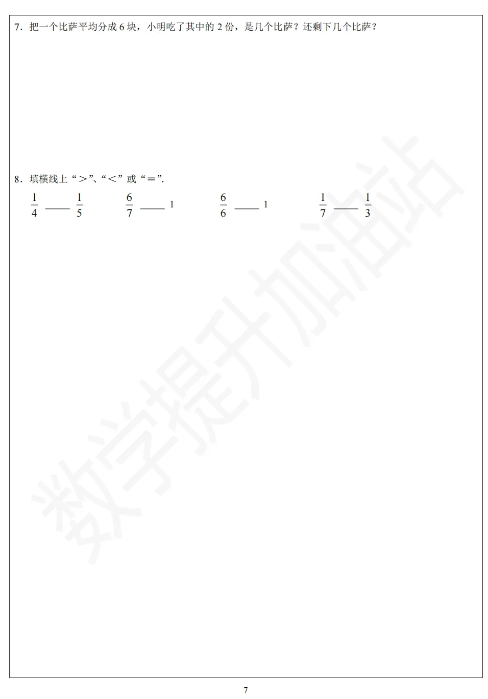 今天给三年级同学准备了完整7页关于【分数的初步认识】的专项练习题,方便家长保存打印,孩子课后练一练,基础更扎实。