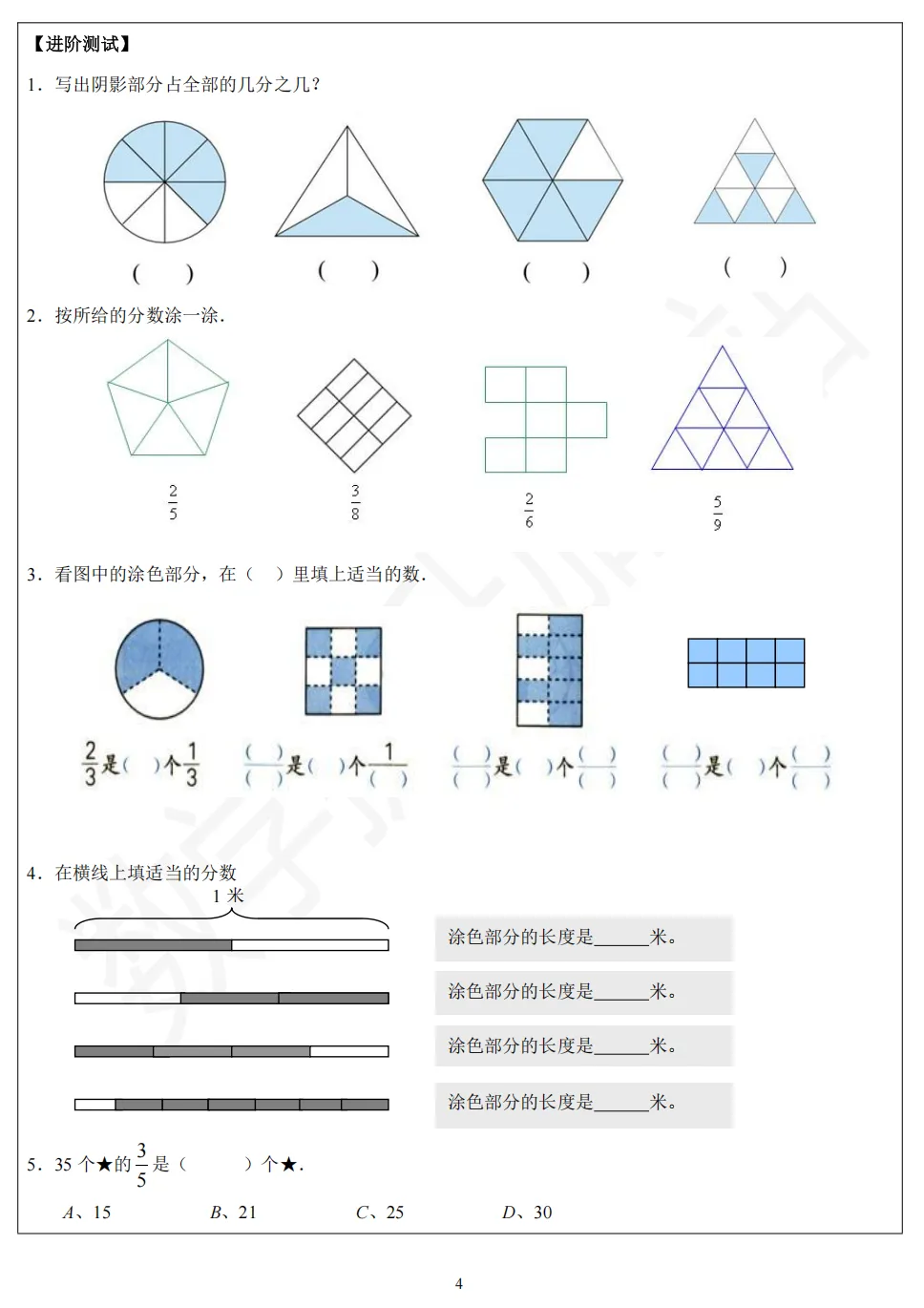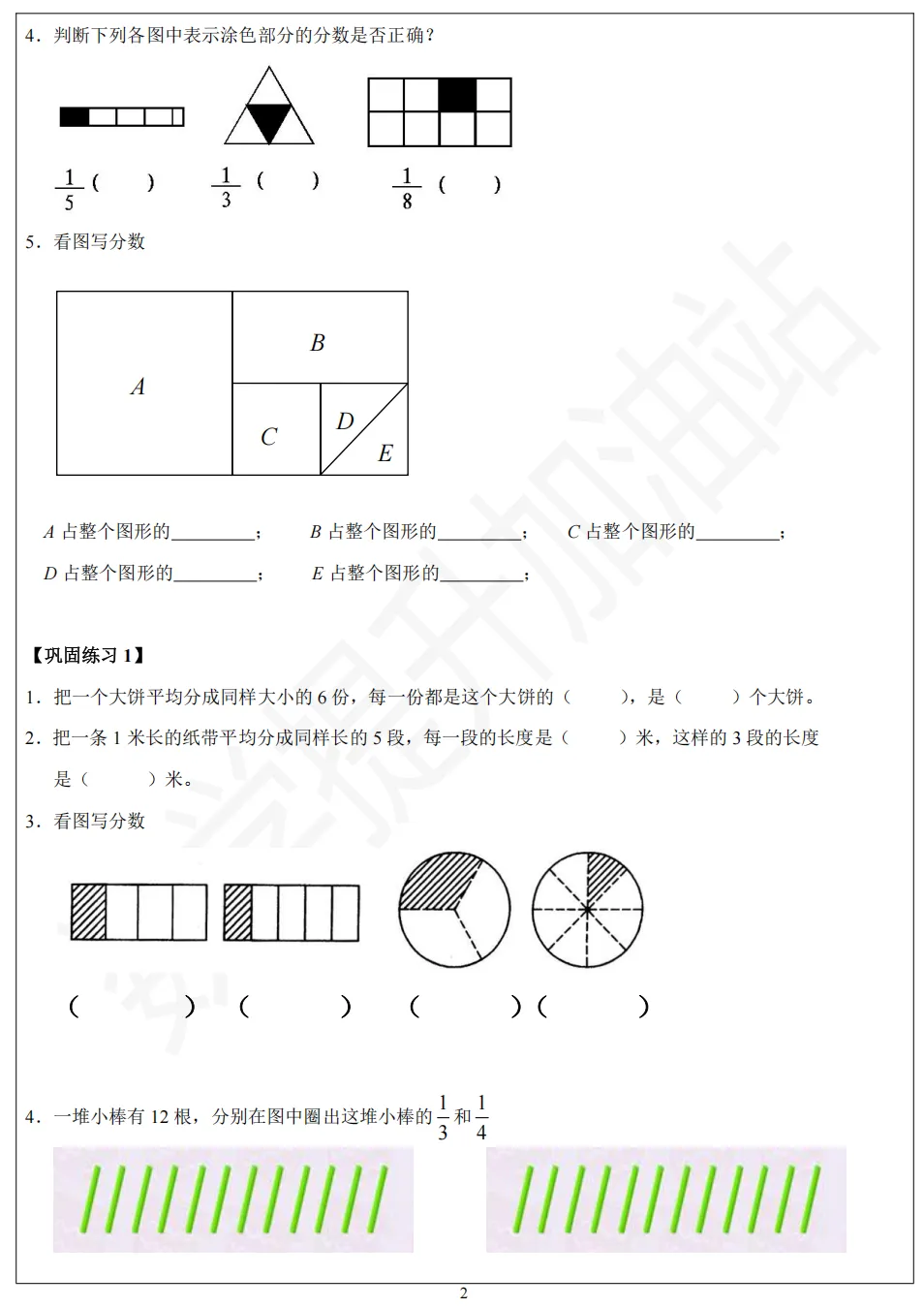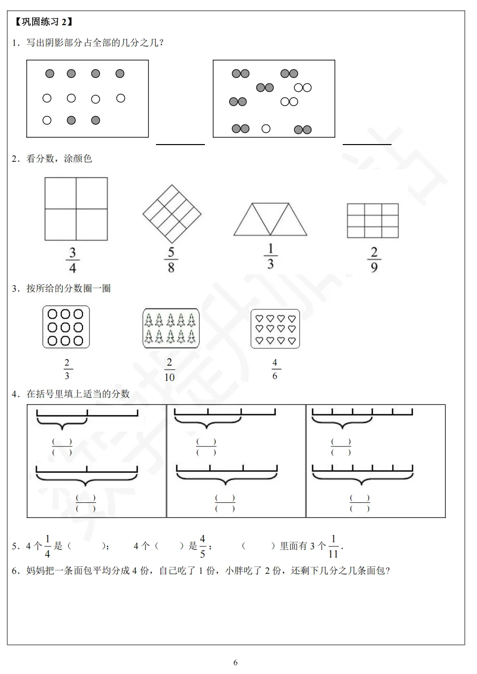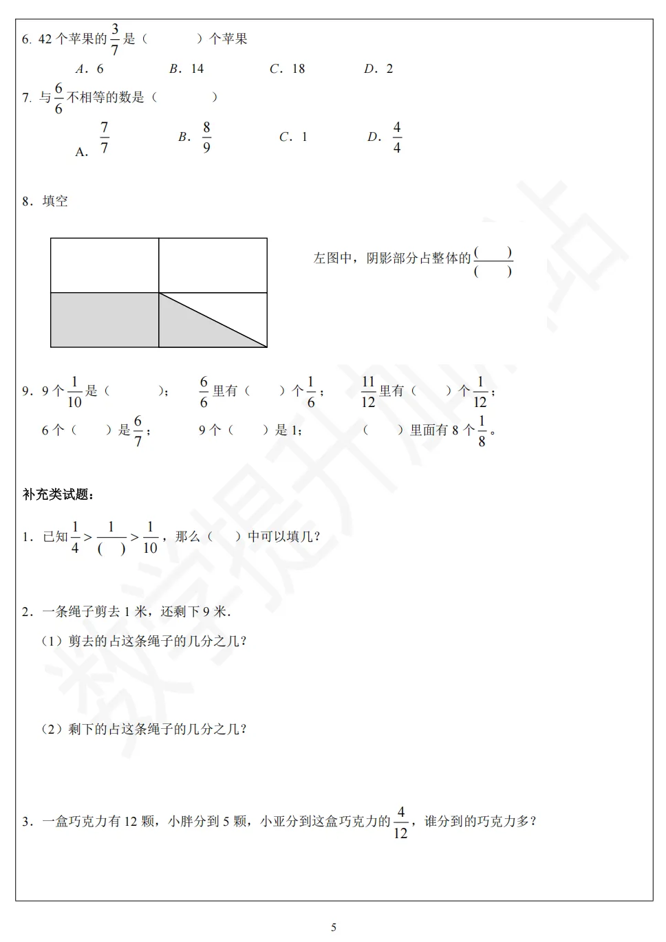 今天给三年级同学准备了完整7页关于【分数的初步认识】的专项练习题,方便家长保存打印,孩子课后练一练,基础更扎实。