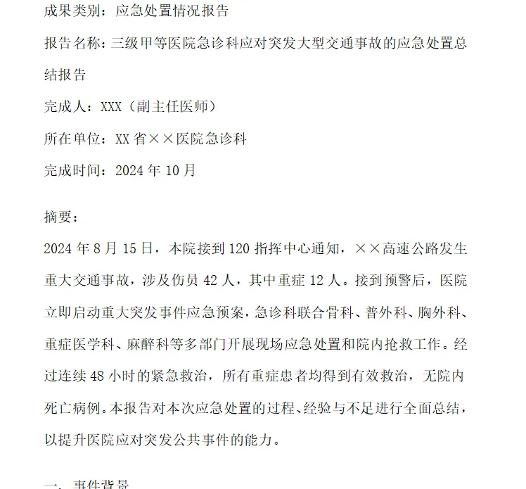 要求:报告应包括应急处置情况、病案首页、诊疗单等相关佐证材料,3000字以内。