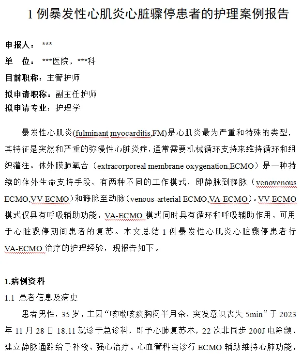 要求:应提交申报人亲自参与护理病例整个过程的记录及相关佐证材料,包括护理过程中的各种评估单、记录单、健康教育单等,以病案记录签名为准。