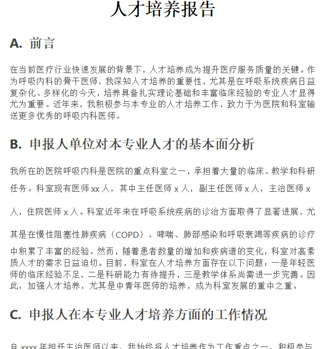 定义:人才培养报告:指带教本专业规范化培训医师、研究生、进修生,以及承担教学课题所形成的报告。