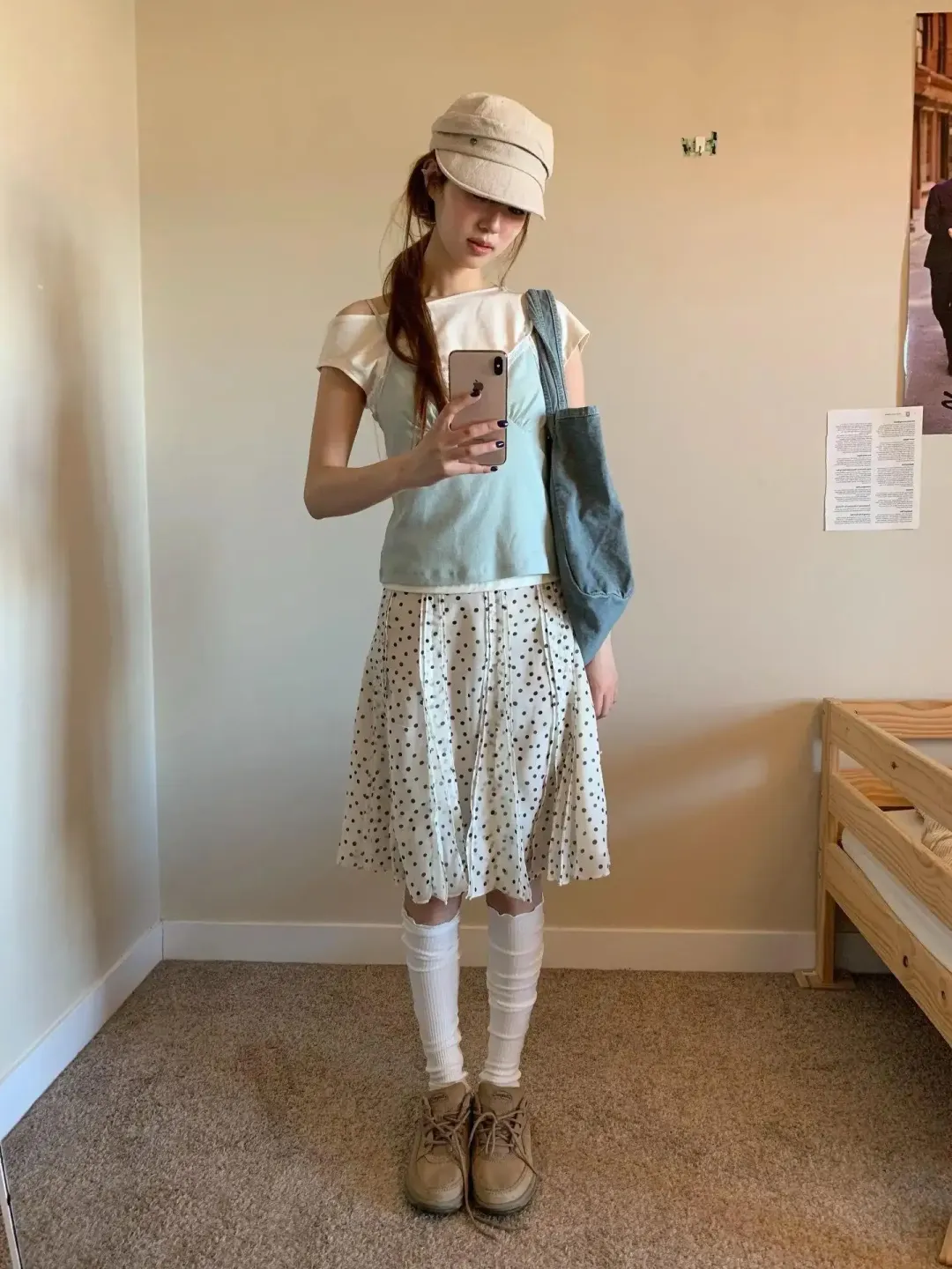 我以前也穿过差不多的白T+吊带,翻车点在袜子。那次我把袜口堆得太松,裙子又刚好到小腿中段,结果下半身像被截成三段,站着还行,走起来特别拖。这里聪明就聪明在:帽子、鞋子、袜子都偏奶咖,颜色没散。✔️还有个细节,包是灰蓝,不抢,但正好把上衣的浅蓝再重复一次。一个颜色出现三次,比你拼四五种色安全太多。