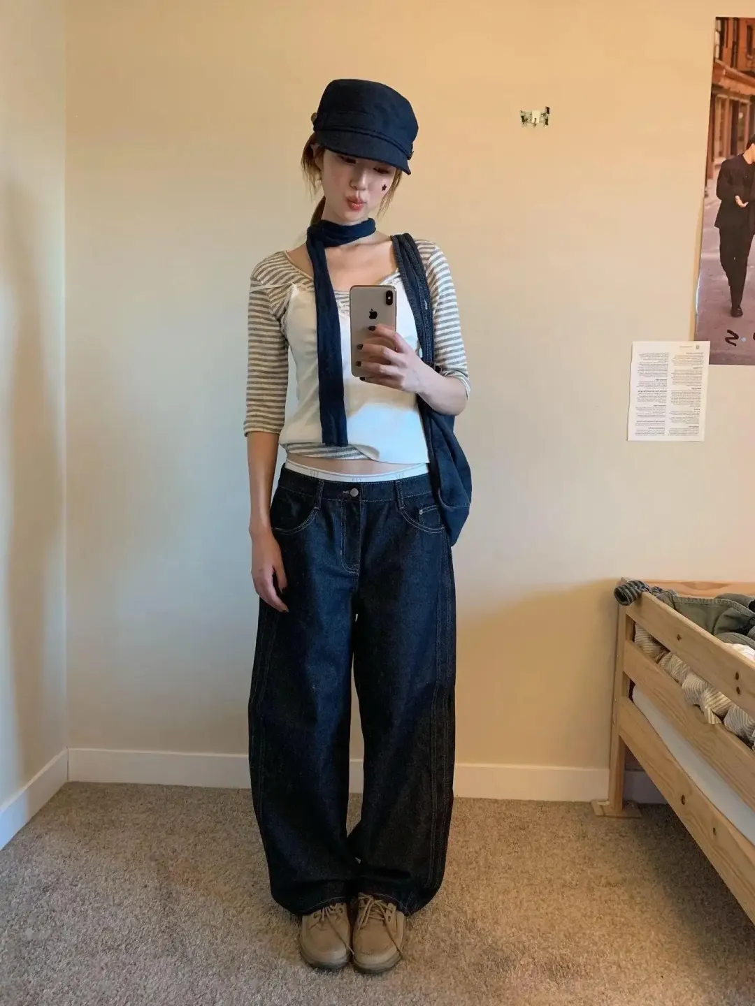 为什么?因为帽子深、裤子深、包也深,中间必须有个竖着垂下来的东西把视线串起来。你看这条围巾不厚,甚至有点随手一搭的意思,但正是这种松,才把上半身收住。我有次穿深色牛仔去见朋友,没加任何纵向配件,照片里肩宽得像比本人多五公分。后来才明白,宽裤不怕宽,怕上半身也横着长。