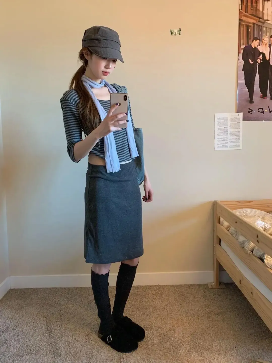 我去年穿针织半裙去开会,坐了两个小时,后摆全是压痕,起身那一下我真的在心里骂人。灰裙尤其吃面料,垂感不够就显旧,太贴又会把胯线全画出来。这套能成立,是因为上衣条纹紧、裙子线条直,外加浅蓝围巾把脸提亮。适用边界也得说清:如果小腿最宽处比较明显,这种袜长就未必友好,往下压到脚踝,或者干脆换长靴,会更稳。❌