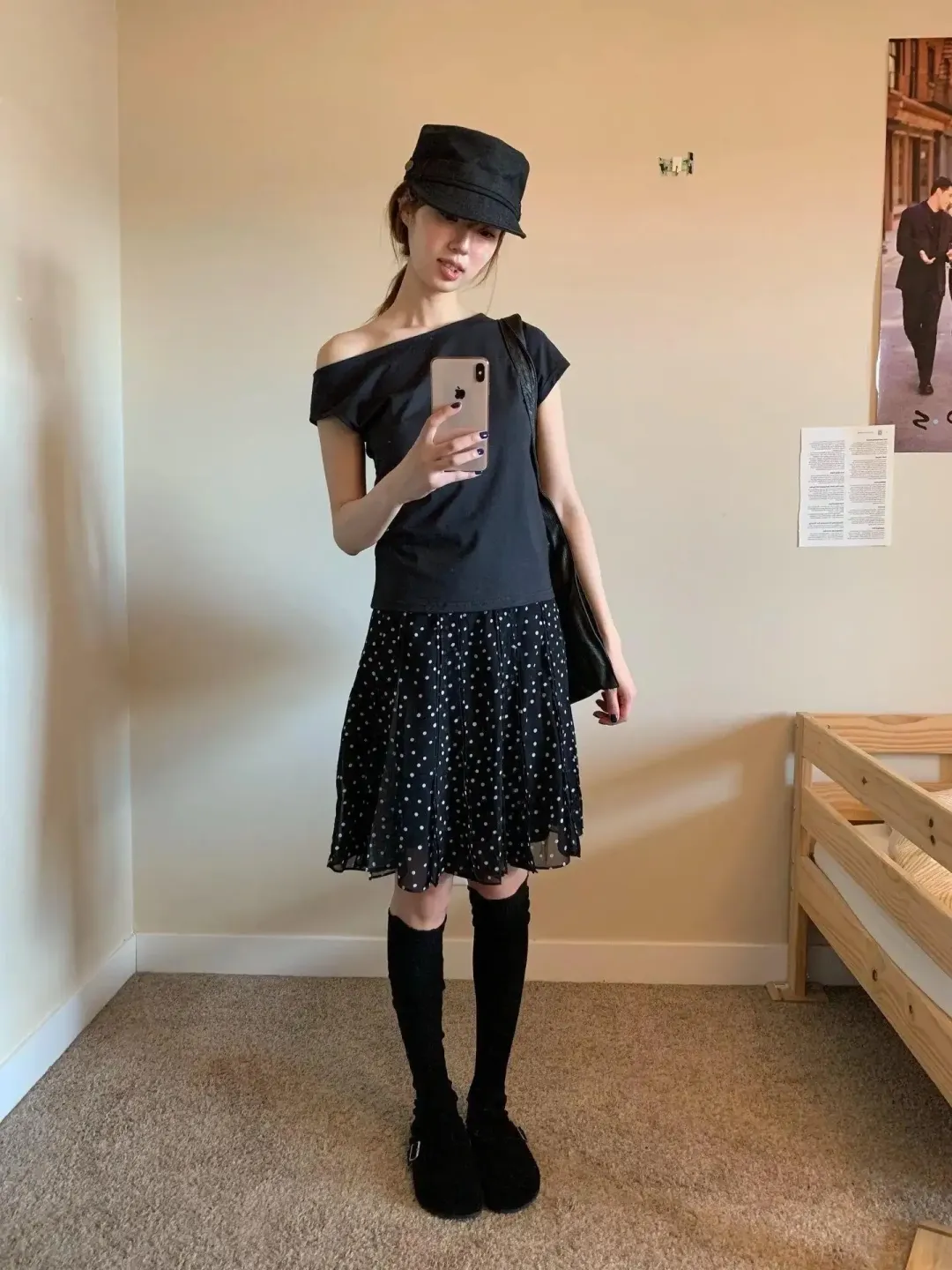 大家都说黑色最稳,但我发现全黑最挑材质。便宜棉T的黑,和轻薄波点纱的黑,放一起如果层次不对,特别像“上面一件下面一件”,不是一套。这里妙在裙摆是轻的,上衣是哑的,反而分出了前后。要是把裙长加十厘米,整个人会沉;短十厘米,又没现在这种轻飘一下的呼吸感。⏰
