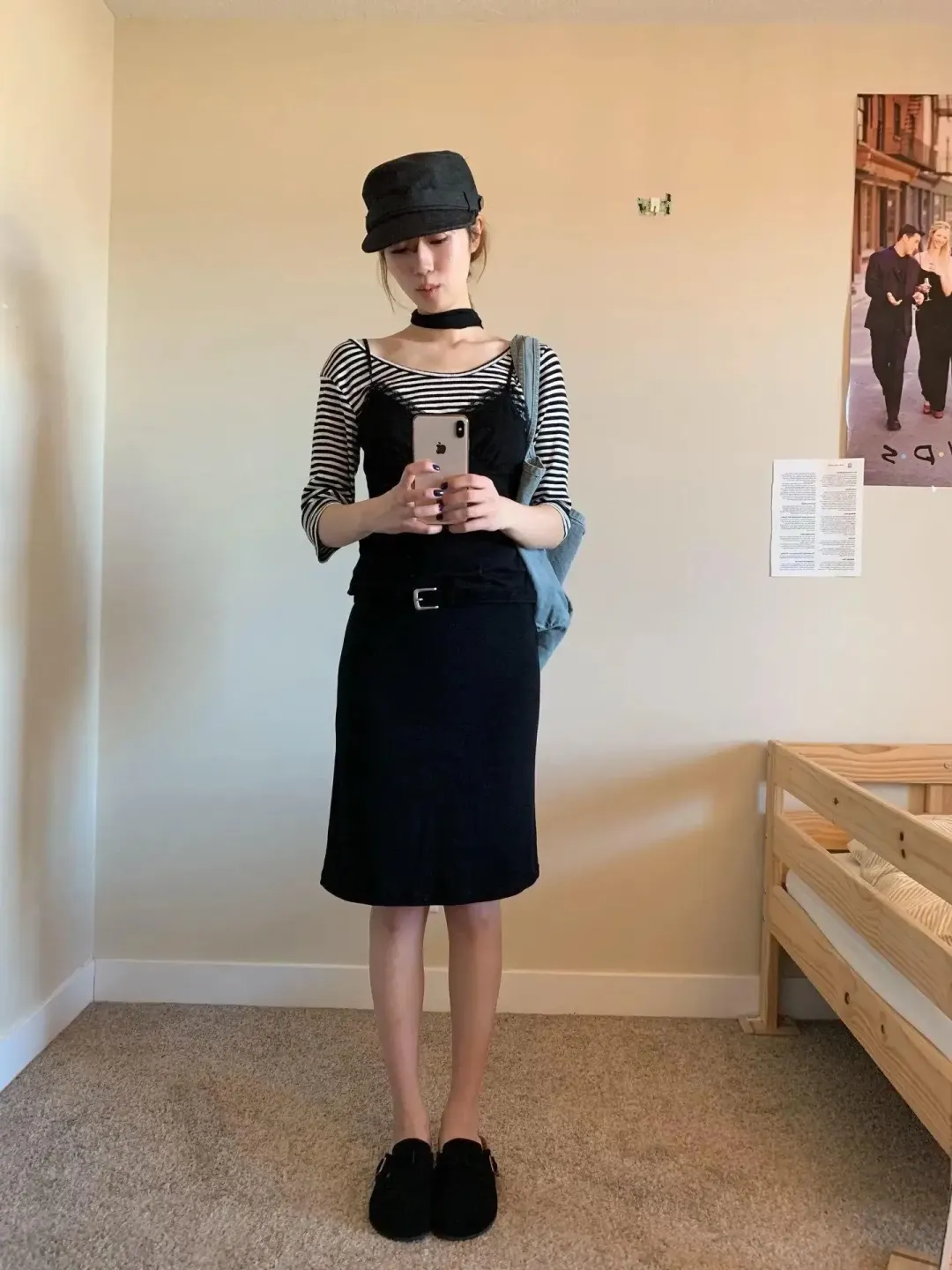 条纹内搭是紧的,外面黑色吊带是窄的,腰上再来一根细皮带,连手机都是双手拿着,整张图的情绪都安静了。这个我特别有感。二十岁时我会嫌这种穿法“太规矩”,现在反而存图,因为它不是无聊,是克制。闺蜜可能会吐槽这套像去上班,我倒觉得正因为没有乱飞的点,才显得干净。💰真想照着试,一个最省事的办法是:选一个主色,把硬线条留给帽子和腰部,把柔软感留给内搭或包。