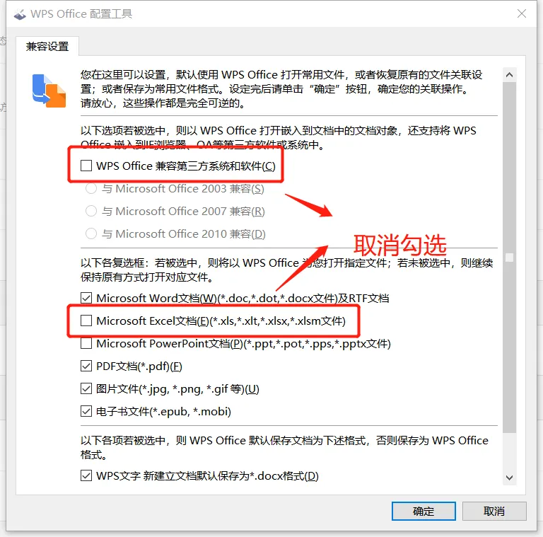 打开WPS设置(点击WPS左上角的"文件" → "选项") 找到 "文件格式关联" 或 "兼容设置" 取消勾选以下选项: "WPS Office兼容第三方系统和软件" **"Microsoft Excel文档 (*.xls, *.xlt, .xlsx, .xlsm)"