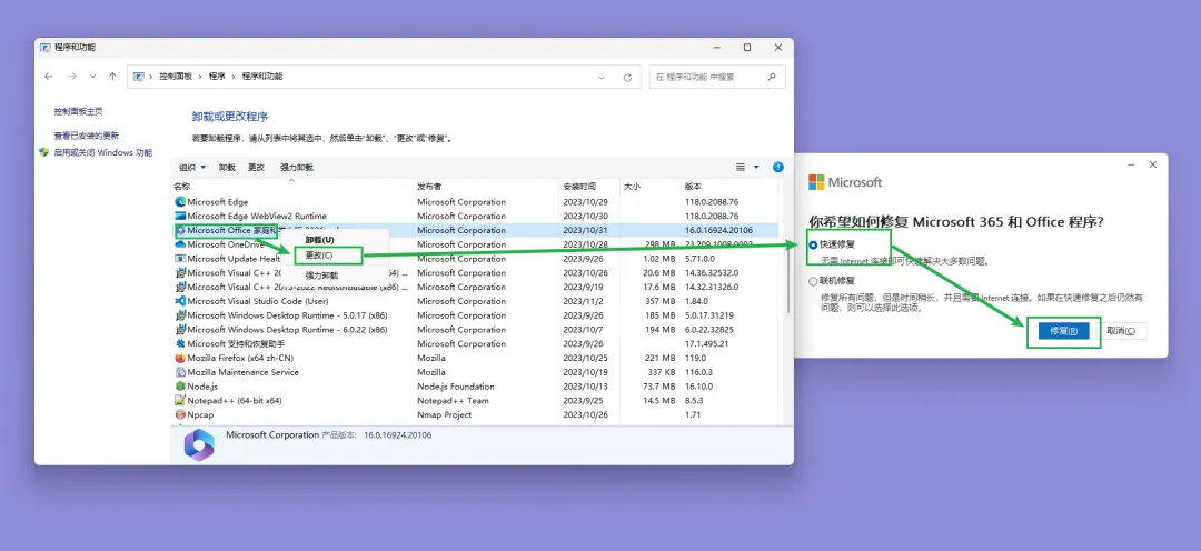 打开 控制面板 → 程序和功能 找到 Microsoft Office,右键点击 "更改" 选择 "快速修复" 或 "联机修复" 修复完成后 重启影刀