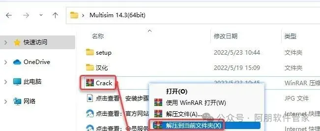 14.打开安装包解压后的【Multisim 14.3(64bit)】文件夹,鼠标右击【Crack】选择【解压到 当前文件夹】。
