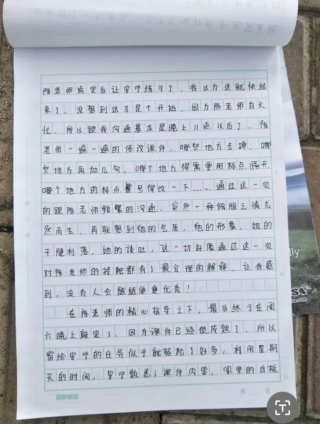 有一天晚上,我儿子交了英语作业,她批改后,我在微信上用同样的彩虹屁对她一顿夸,说您太不容易了,看朋友圈您也是两个孩子的妈妈,这么晚了,自己的孩子都顾不上,还在给你学校的几十个孩子批作业,太伟大了。