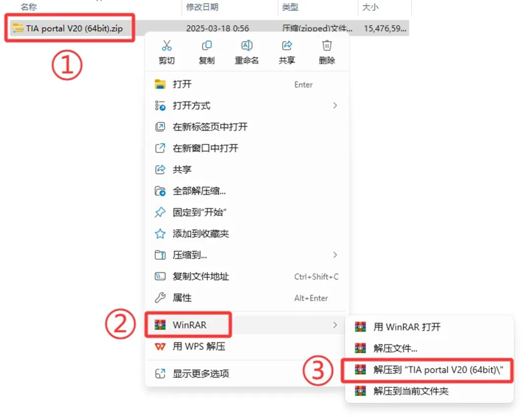 1.解压安装包:①鼠标右击【TIA portal V20(64bit)】压缩包②选择电脑上安装的解压软件③点击【解压到TIA portal V20 (64bit)】。