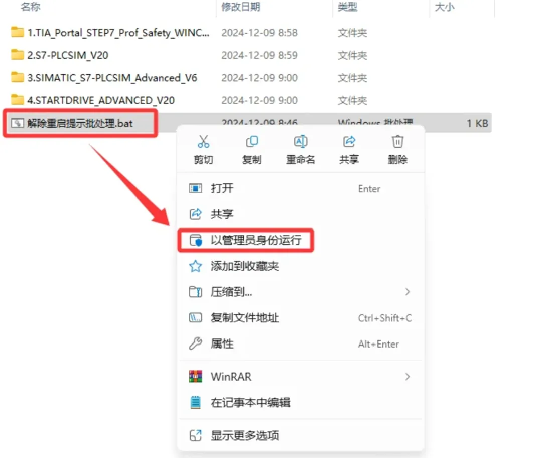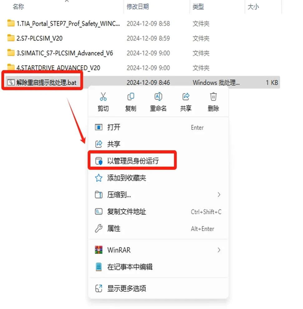26.打开安装包解压后的【TIA portal V20(64bit)】文件夹中的【Setup】文件夹,鼠标右击【解压重启提示批处理】选择【以管理员身份运行】。