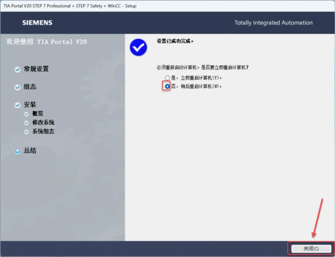 25.选择【否,稍后重启计算机】,点击【关闭】。