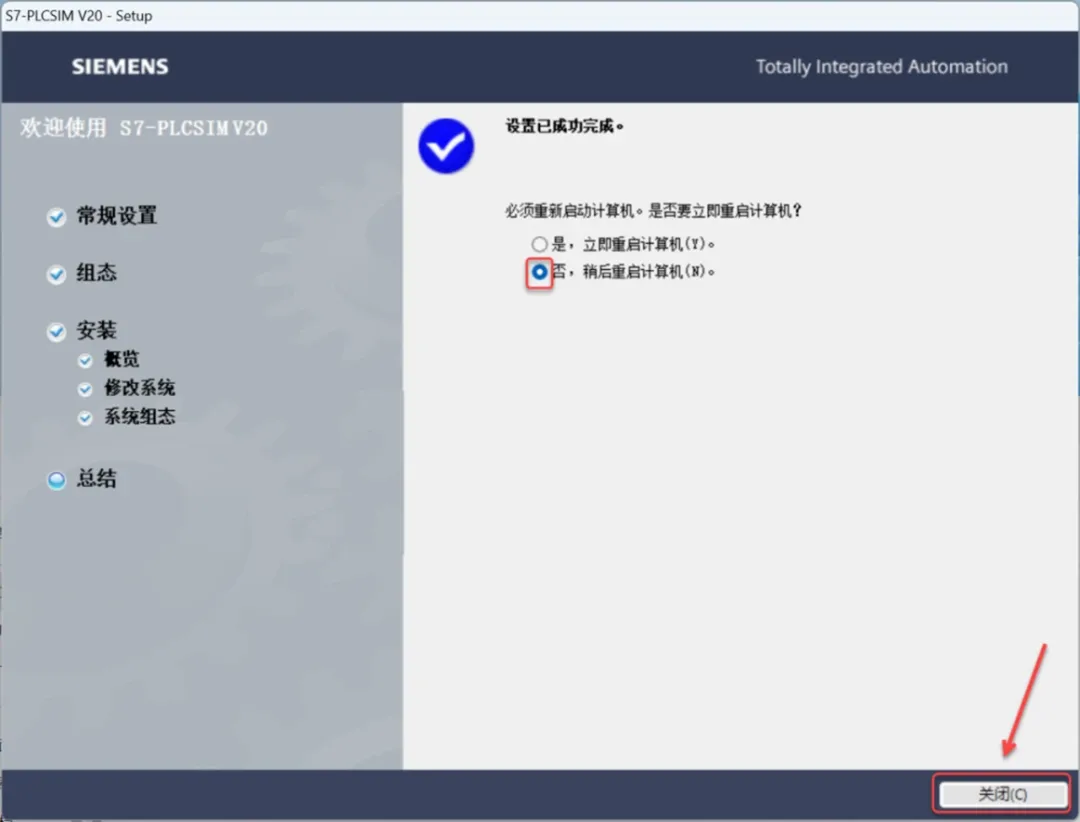 15.选择【否,稍后重启计算机】,点击【关闭】。
