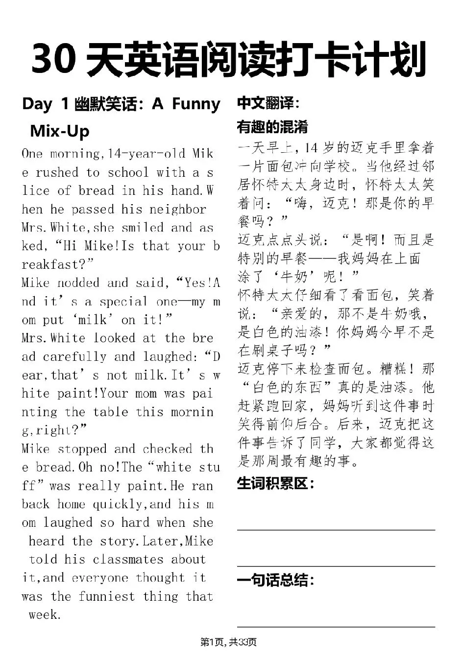 其实只要坚持每日阅读练习,养成做题语感、掌握解题技巧,阅读正确率就能稳步提升。今天给大家整理了中考提分必看的【英语30天阅读打卡计划】,全是中考高频阅读题型、针对性强、安排清晰、简单好坚持,不管是日常积累还是考前冲刺都超实用。