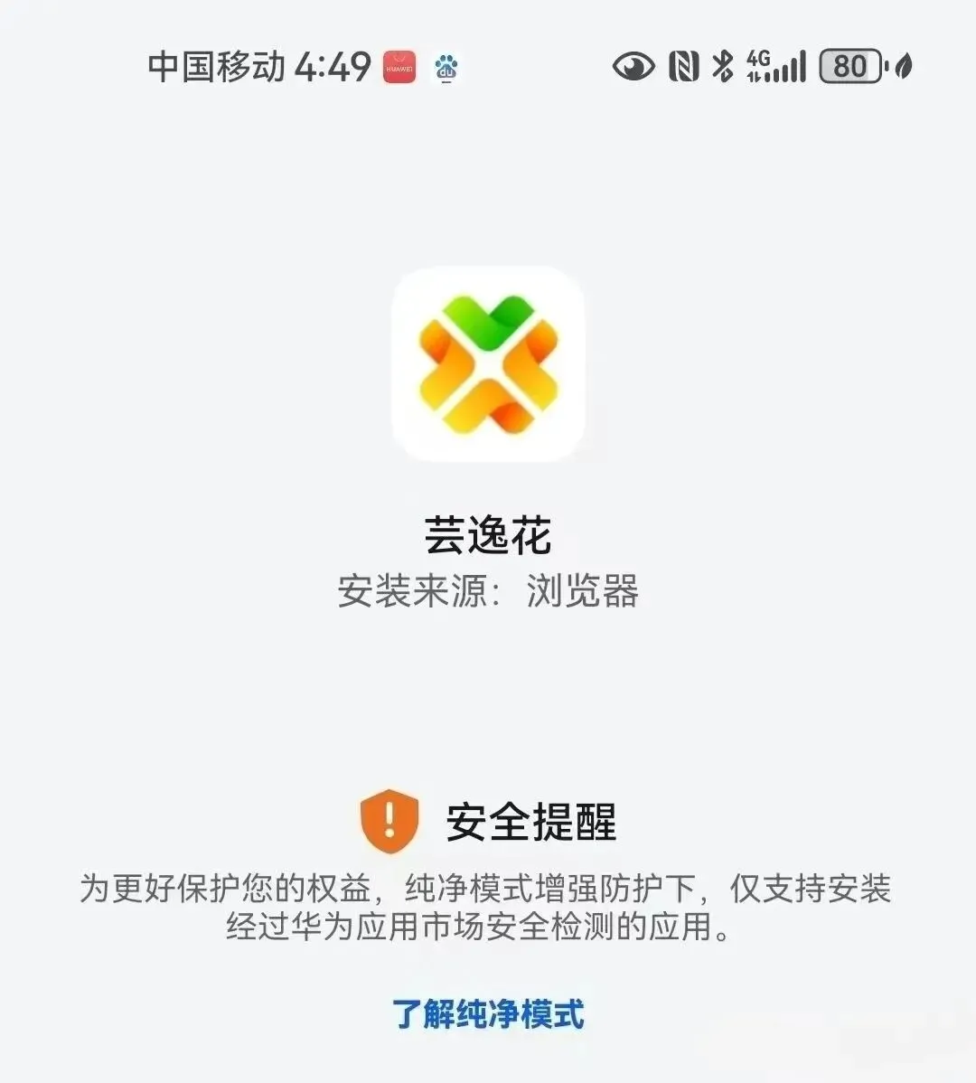 2、安卓端:目前芸逸花(原芸豆花)当前安卓端是可以正常使用并还款的,只是因为平台的有些参数没有调整完成,导致有些用户无法下载或者会被系统拦截。也有一些人下载后被系统自动删除或者出现闪退等情况。这个很大的可能是手机打开了“纯净模式”的选项,找到并把这个模式关掉就可以下载使用了。