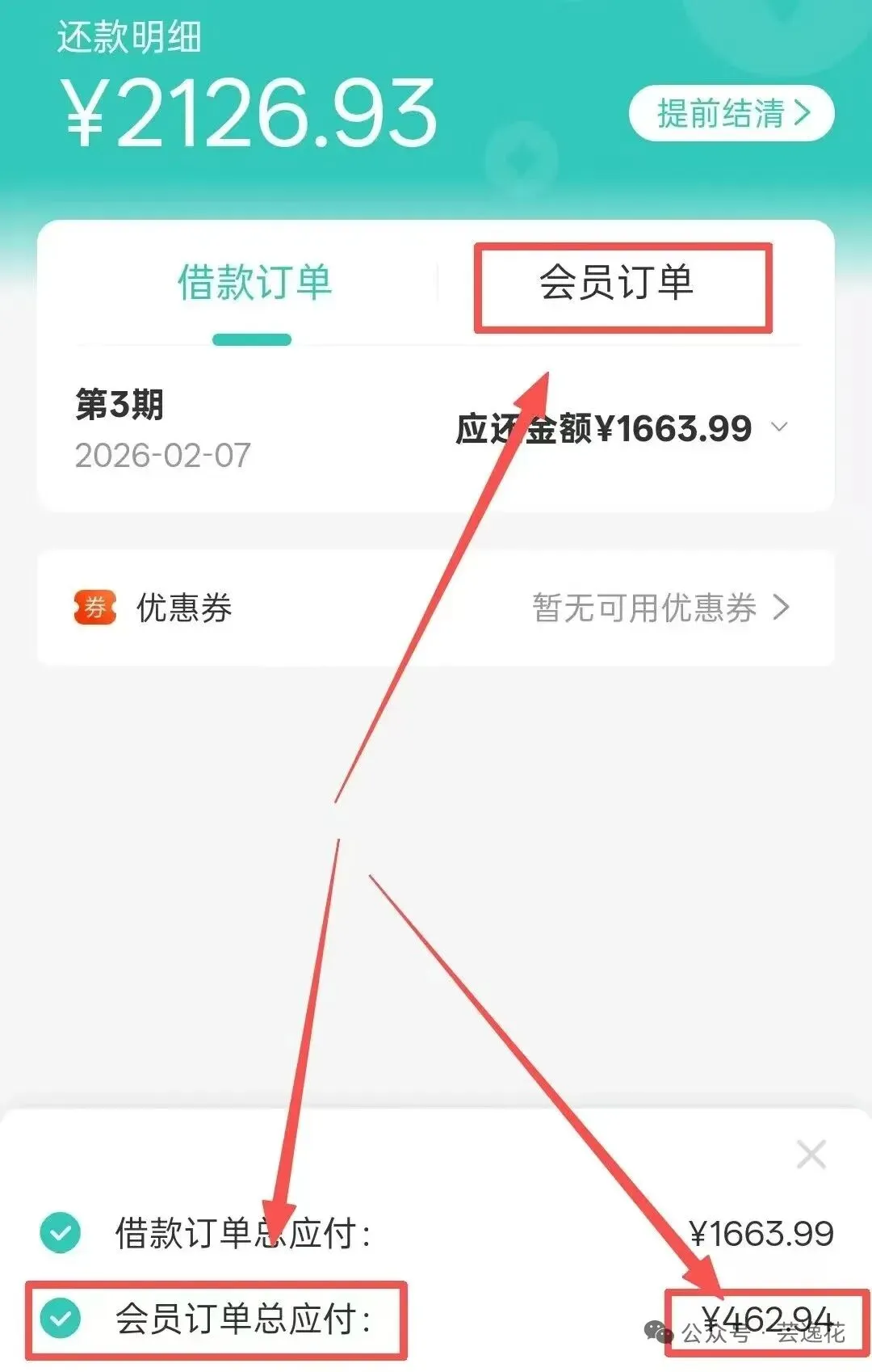 1、额外“会员费”怎么查:如果你有被多收额外会员费的情况,可以打开自己的还款明细界面,在会员订单界面就能看到,如下: