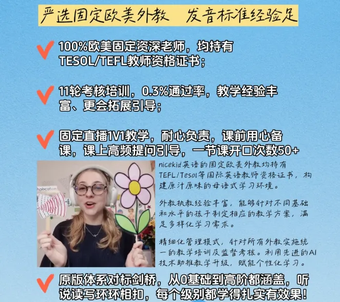 在同类型欧美外教中具有一定的竞争优势,结合外教质量和固定机制,我觉得性价比不错。而且有免费试听课,可以扫码或复制链接【http://m.nicekid.hk/t/gzh10】进入浏览器即可0元免费领,试听再决定,这点很安心。