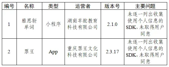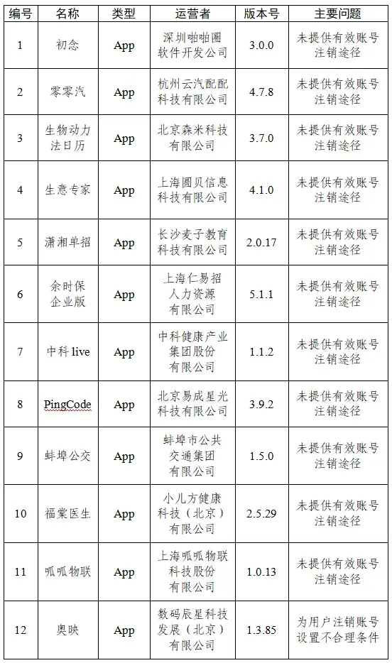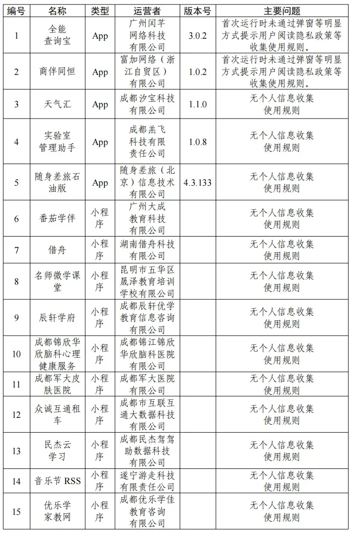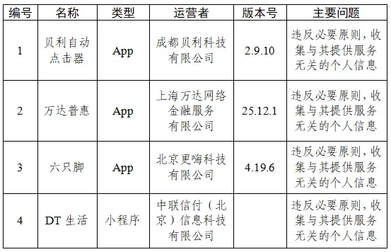 根据中央网信办、工业和信息化部、公安部联合发布的《关于开展2026年个人信息保护系列专项行动的公告》,依据《网络安全法》《个人信息保护法》《网络数据安全管理条例》《App违法违规收集使用个人信息行为认定方法》等法律法规和有关规定,中央网信办组织对App(含小程序)收集使用个人信息行为进行检测,现对有关问题予以通报:一、全能查询宝、商伴同恒等15款App无个人信息收集使用规则或在首次运行时未通过弹窗等明显方式提示用户阅读个人信息收集使用规则(详见下表)。二、雅思斩单词、票豆等2款App未逐一列出收集使用个人信息的SDK,未取得用户同意(详见下表)。三、贝利自动点击器、万达普惠等4款App违反必要原则,收集与其提供的服务无关的个人信息(详见下表)。四、初念、零零汽等12款App未提供有效账号注销途径或为用户注销账号设置不合理条件(详见下表)。相关App运营者应当于本通报发布之日起的15个工作日内完成整改,并将整改情况报我办。我办将会同有关部门进行核查,并结合整改情况依法依规开展处置处罚。联系电话:010-55635865,邮箱:appzhili@cac.gov.cn 白云区街坊群