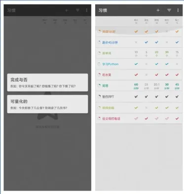 打开软件,点击主界面右上角的加号按钮,可以看到2种习惯添加方式,包括完成与否和可量化的,完成与否的例子包括你今天早起了吗、你今天跑步了吗,可量化的例子包括你今天学习了多少个单词、你今天跑步了几公里。