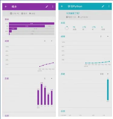 它支持强大的数据统计功能,点击任意一个习惯可以进入数据统计界面,这里提供了丰富精美的图表,包括:总览、目标、成绩、历史、日历、最佳连续完成次数、频率等,你的习惯完成情况一目了然。
