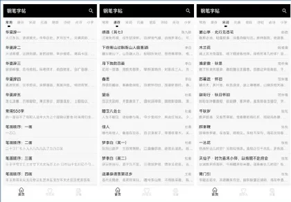 它支持丰富的文字内容,包括:常用、唐诗、宋词、元曲、楚辞、诗经、古诗、小学、初中、高中。