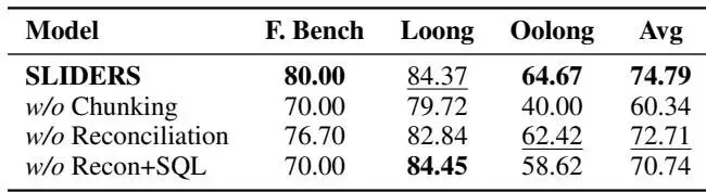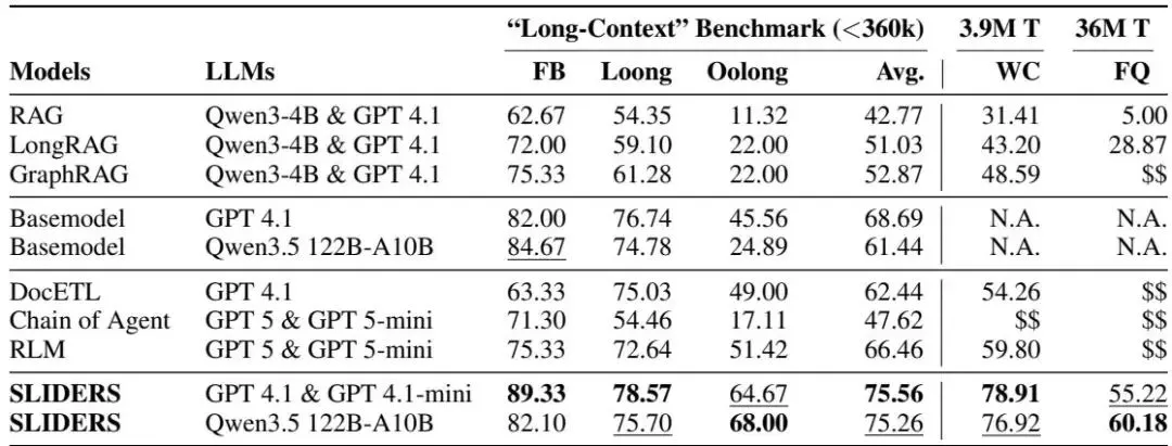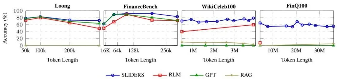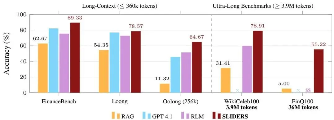 在三个适合强大基础 LLM 上下文窗口的长上下文基准测试中,SLIDERS 的表现优于所有基线,平均超过 GPT-4.16.6 个百分点。在包含 100 个文档、总计 3.9M token 和 36M token 的两个新基准测试上,SLIDERS 在 Wikipedia 上达到 78.91% 的准确率,在金融文档上达到 55.22%。