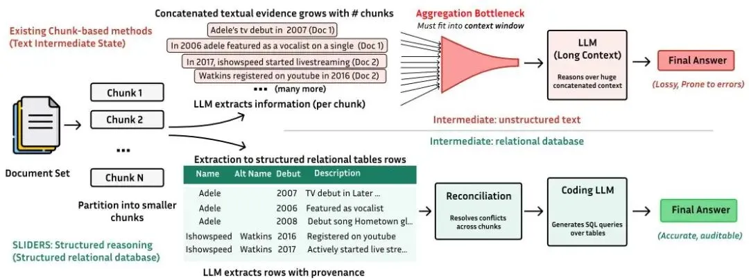 🏗️传统方法:将文档分块后用 LLM 拼接推理,面临聚合瓶颈 ✨SLIDERS:提取到数据库,用 SQL 进行可扩展推理 |