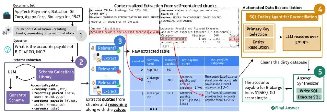 | 💡 核心思路:结构化推理 不依赖 LLM 对拼接的分块输出进行推理,而是将关键信息提取到关系数据库中,将非结构化文本转换为持久的结构化状态。推理简化为查询:在数据库上执行 SQL 来聚合、比较和计算提取的证据。 |