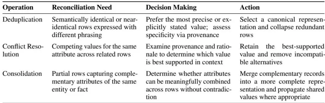 | 📍 数据协调 文档在不同粒度级别上分发、重复和完善信息。协调通过将重叠、部分或冲突的记录对齐到一致的关系状态来应对这一挑战。按主键将行分组,在小的、语义一致的分区中协调重叠的证据。 |