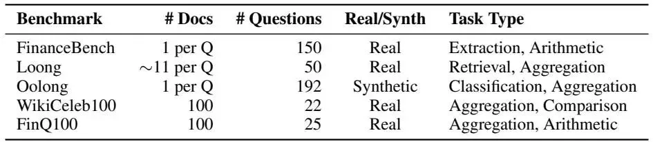 FinanceBench:单文档金融问答基准测试,包含 150 个关于上市公司的问题 Loong:多文档问答基准测试,涵盖金融(中英文)、法律(中文)和学术论文(英文) Oolong:明确专注于聚合的长上下文推理基准测试,模型需先分类数据点再聚合 |