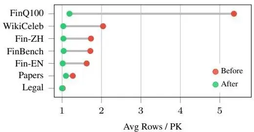 总体而言,调和不仅仅是删除重复行:它将嘈杂的局部提取转换为近规范的结构化表示,每主键约 1 行。 |