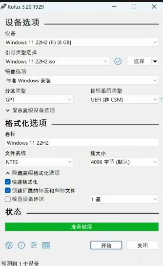 1.插入 U 盘,打开 Rufus 工具,软件会自动识别 U 盘,确认 “设备” 是你的 U 盘(别选错,避免格式化错硬盘)。