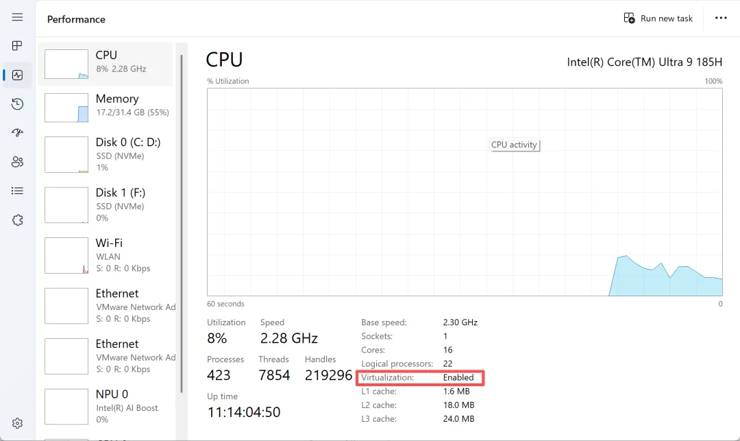 CPU: 64位处理器(Intel i5/i7 或 AMD Ryzen 以上,主流电脑都满足)内存: 最低 8GB,但运行容器建议 8GB+硬盘: 至少 80GB 可用空间(Docker 镜像会占用不少空间)BIOS: 需要开启虚拟化技术(VT-x/AMD-V)