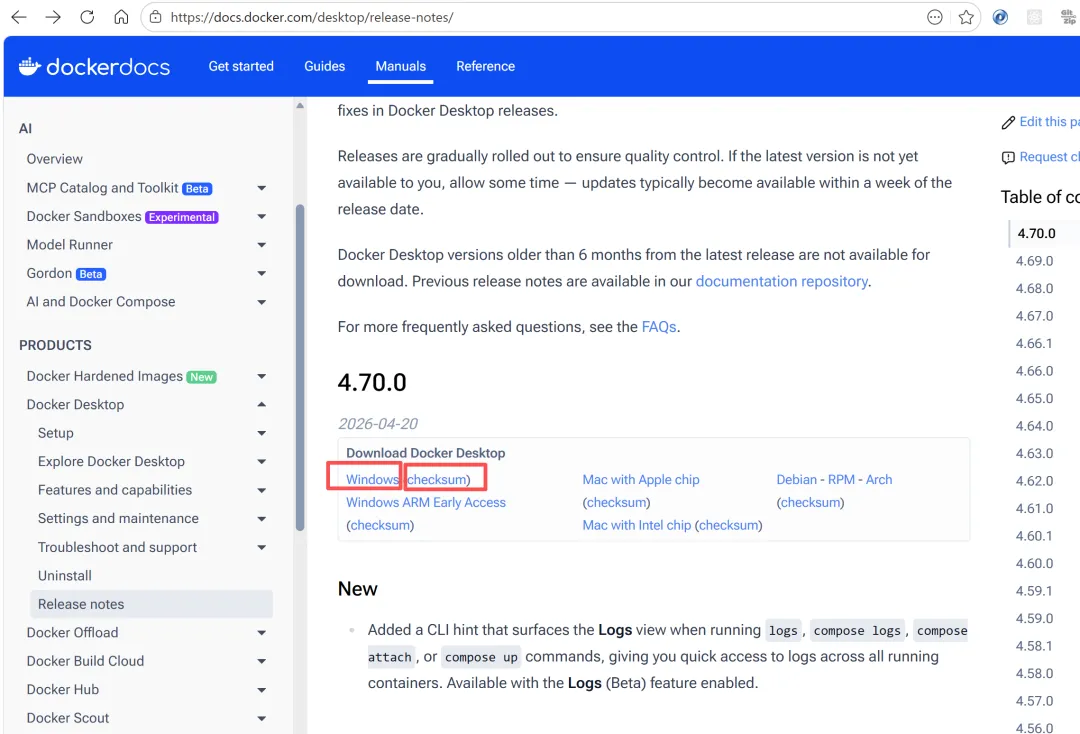 在网站Docker Desktop release notes | Docker Docs中可以看到发布版本并进行下载,同时可以看到官方发布的校验码。