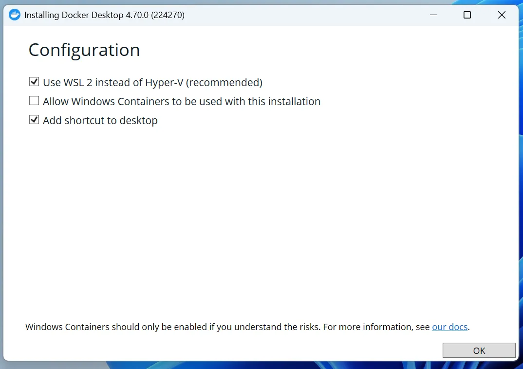 | Allow Windows Containers to be used with this installation | 此安装允许安装Windows容器 | ✅ 默认未勾选,不勾选即可 |