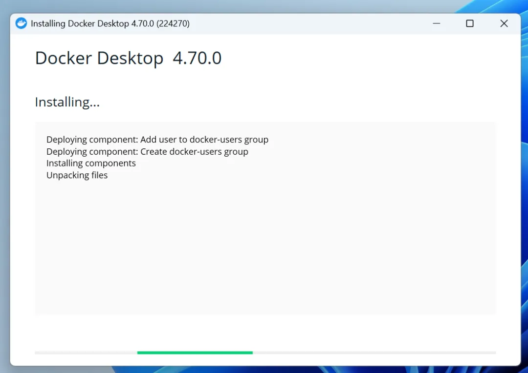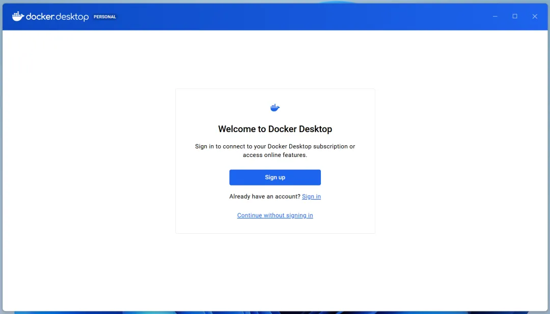 安装进入比较慢,需要5-15分钟,等待安装完成后,可以重新打开Docker Desktop,或者在任务图标栏中,右键图标,退出应用,然后重新双击图标打开。