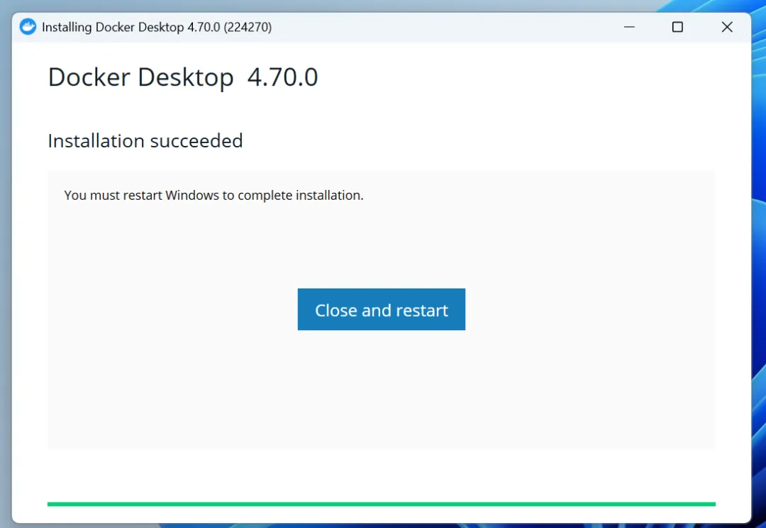 看到「Installation succeeded」后,点击「Close and restart」,会进行关机重启。