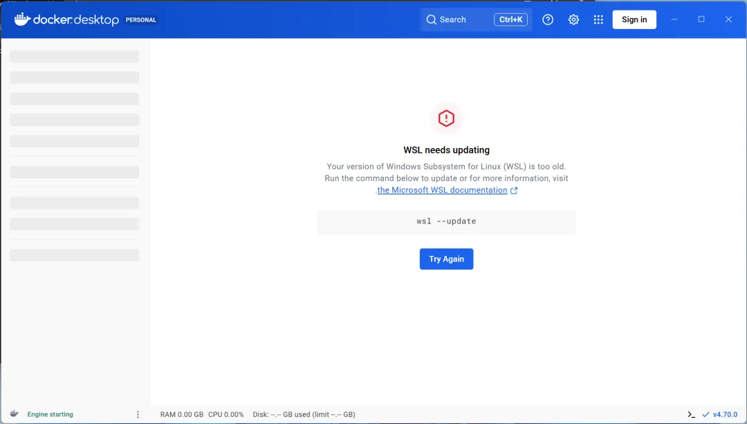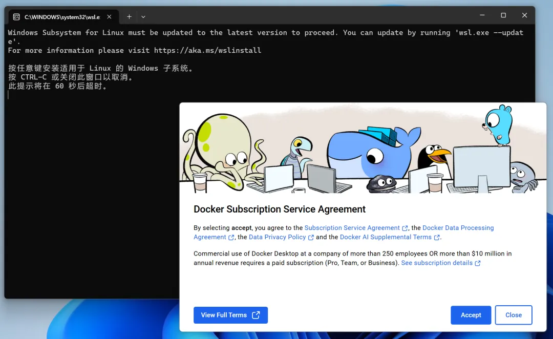⚠️ 如果提示需要更新 WSL2:按提示操作,这一步很重要,WSL2 是 Docker 运行的基础。否则无法正常启动,点击同意协议的按钮也无法正常启动。