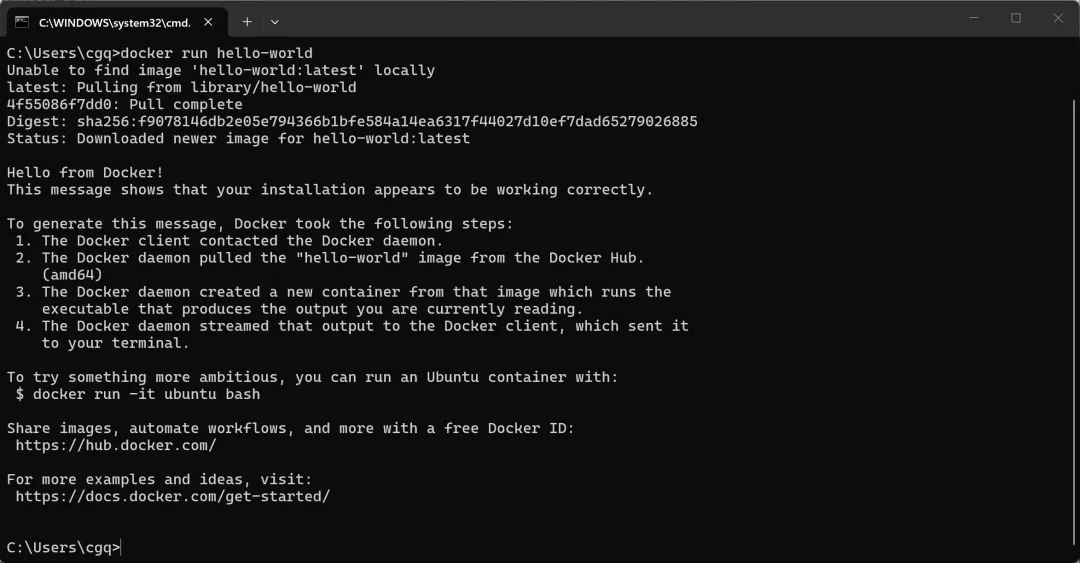 安装完成了,怎么确认 Docker 真的在工作?我们来跑一个「Hello World」容器。