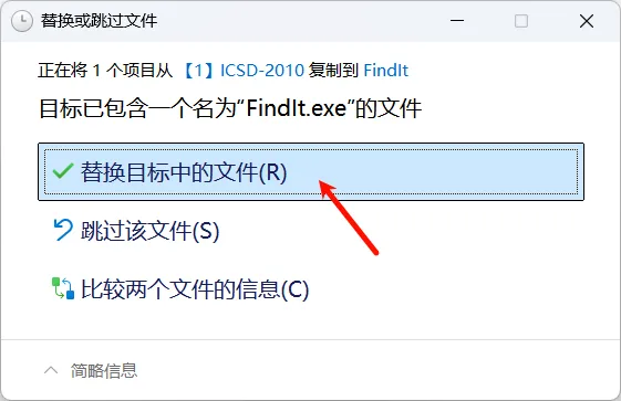 回到最开始的安装文件【1】ICSD-2010中复制Findit.exe文件,然后在桌面找到刚安装的Findit图标,右键单击鼠标,选择打开文件所在位置,直接粘贴到此处,选择替换目标中文件。
