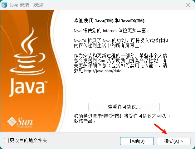 安装后自动开始安装java,直接点击接受即可,直到完成。