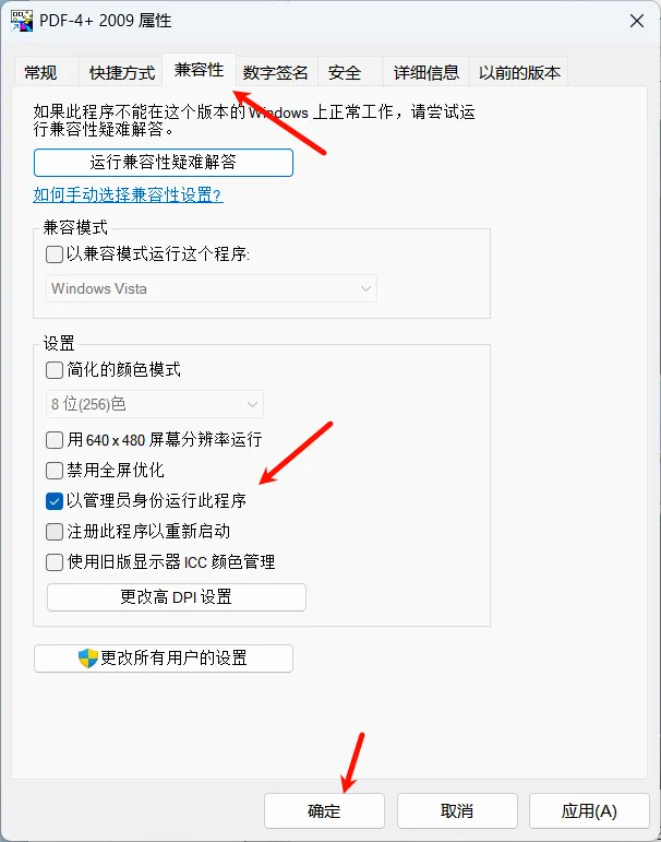 右单击桌面PDF-4+2009快捷方式,选择属性,进入兼容性,勾选以管理员运行此程序,然后点击确定。
