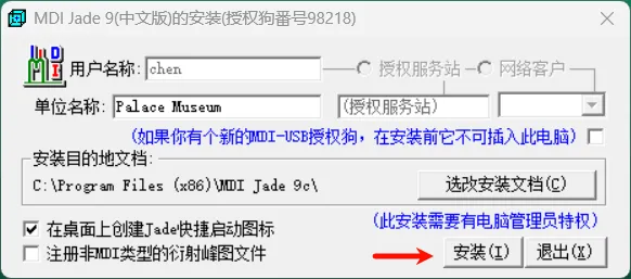 右单击桌面的MDI Jade 9(中文版)快捷方式图标选择属性,进入兼容性,勾选以管理员运行此程序,然后点击确定。这一步就是设定管理员权限,跟前面一样。